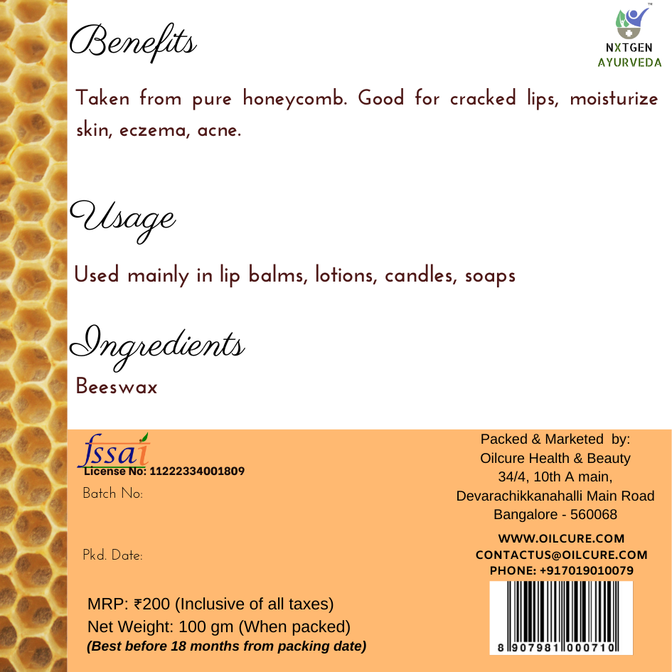 Beeswax is wax derived from the honeycomb. It is very good for cracked lips as lip balms, for skin, psoriasis, and eczema, Helps remove acne/pimples, diaper dermatitis and moisturizes your skin. It helps to remove stretch marks also. It is being used mainly in lip balm, lotions, soaps and external application body care products.