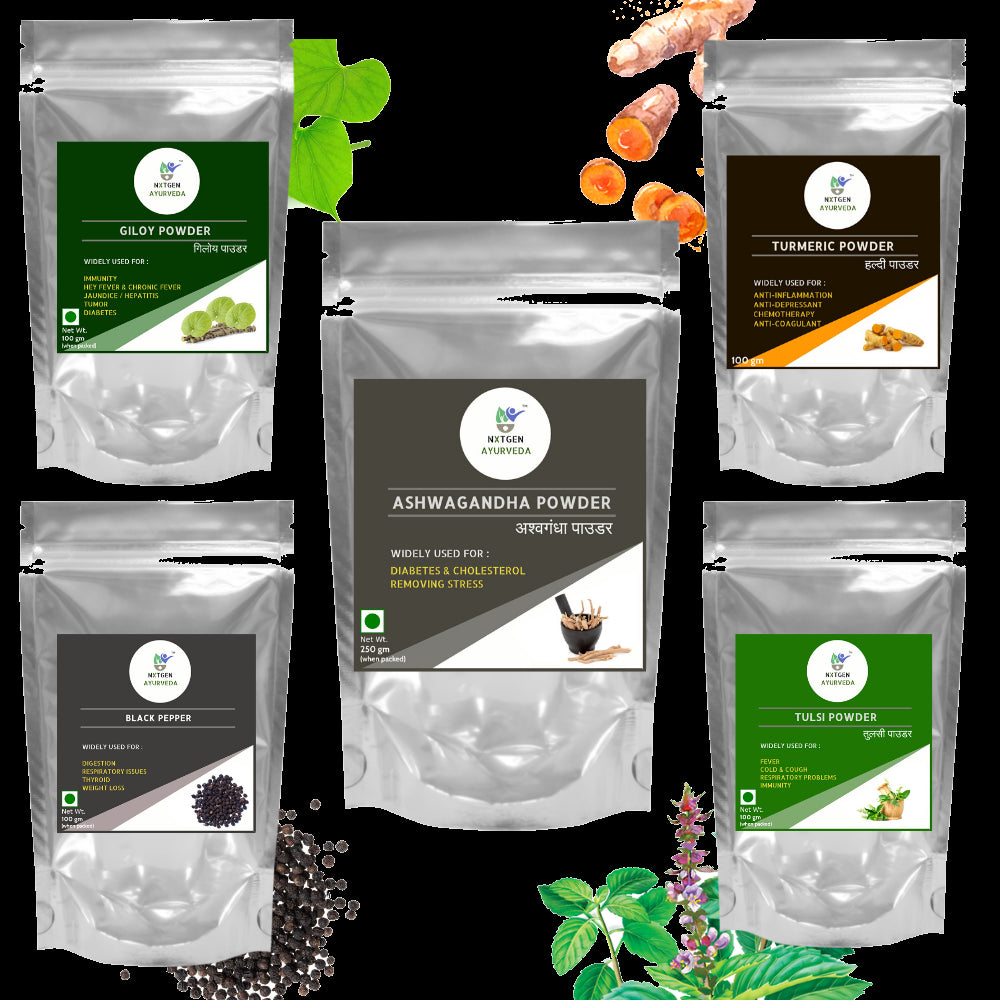 As per Ayurveda, you must improve your immunity to its best. This improved immunity will fight the viruses of many kind, and let you survive in tough times. This pack has immunity boosters and disease fighter natural herbs - Ashwagandha, Giloy, Turmeric, Tulsi and Black Pepper.