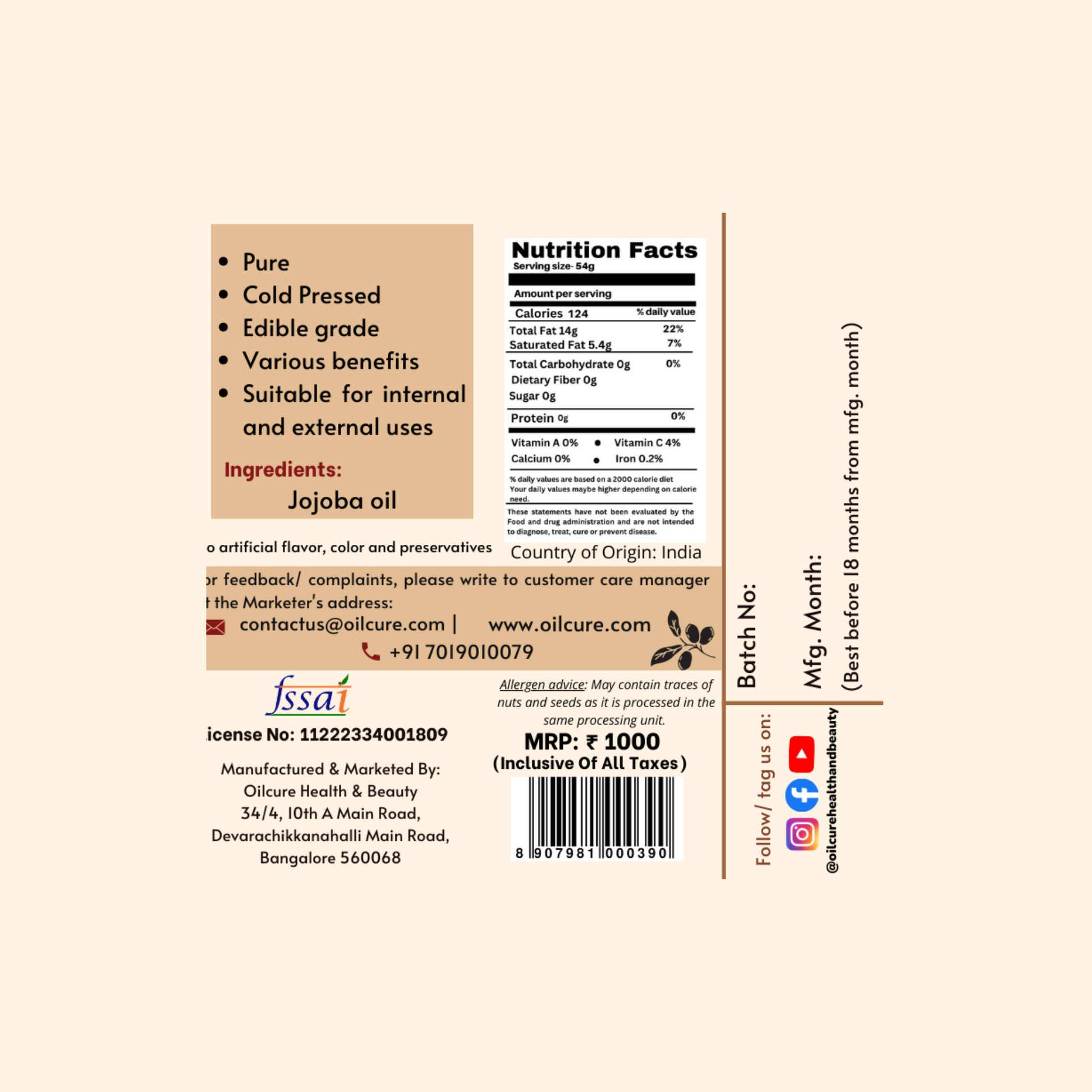 Jojoba Oil, cold pressed is full of vitamin E, which is very good for your skin and hair. Jojoba moisturizes and make your skin radiant and elastic. It works like a natural sunscreen. Great oil for reducing dark circles with regular use of this jojoba oil.