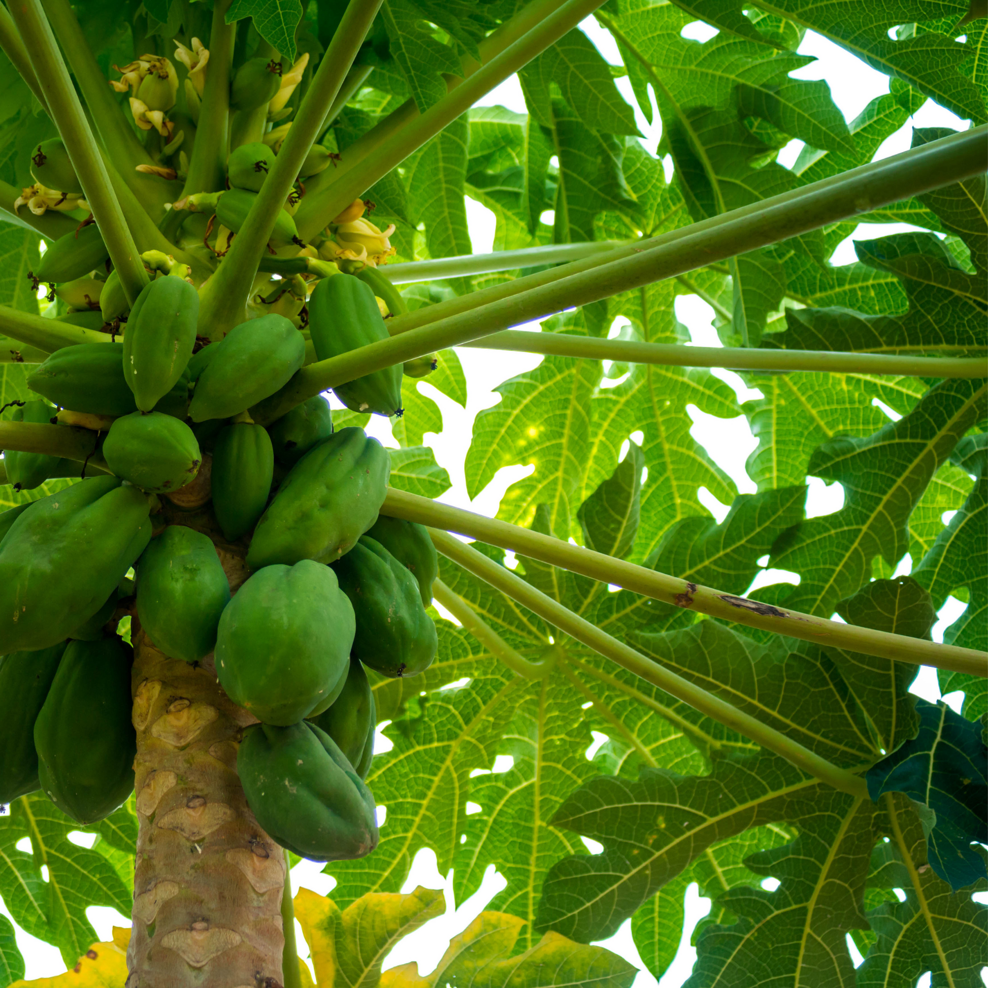 Papaya leaves are rich in vitamins and minerals, such as vitamins A, B1, C and E, protein, calcium, phosphorus, iron and water. Its juice has an important enzyme called papain that aids in digestion by breaking down the proteins naturally.
