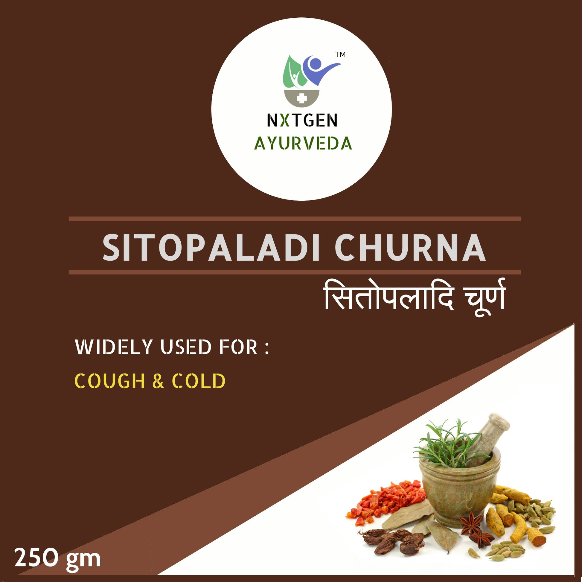 Sitopaladi Churna is an Ayurvedic product, used in the treatment of respiratory diseases, cough, burning sensation in palms and feet, low digestion power, loss of sensation in the tongue, pain in abdomen, flanks, anorexia, fever, bleeding from the nose.